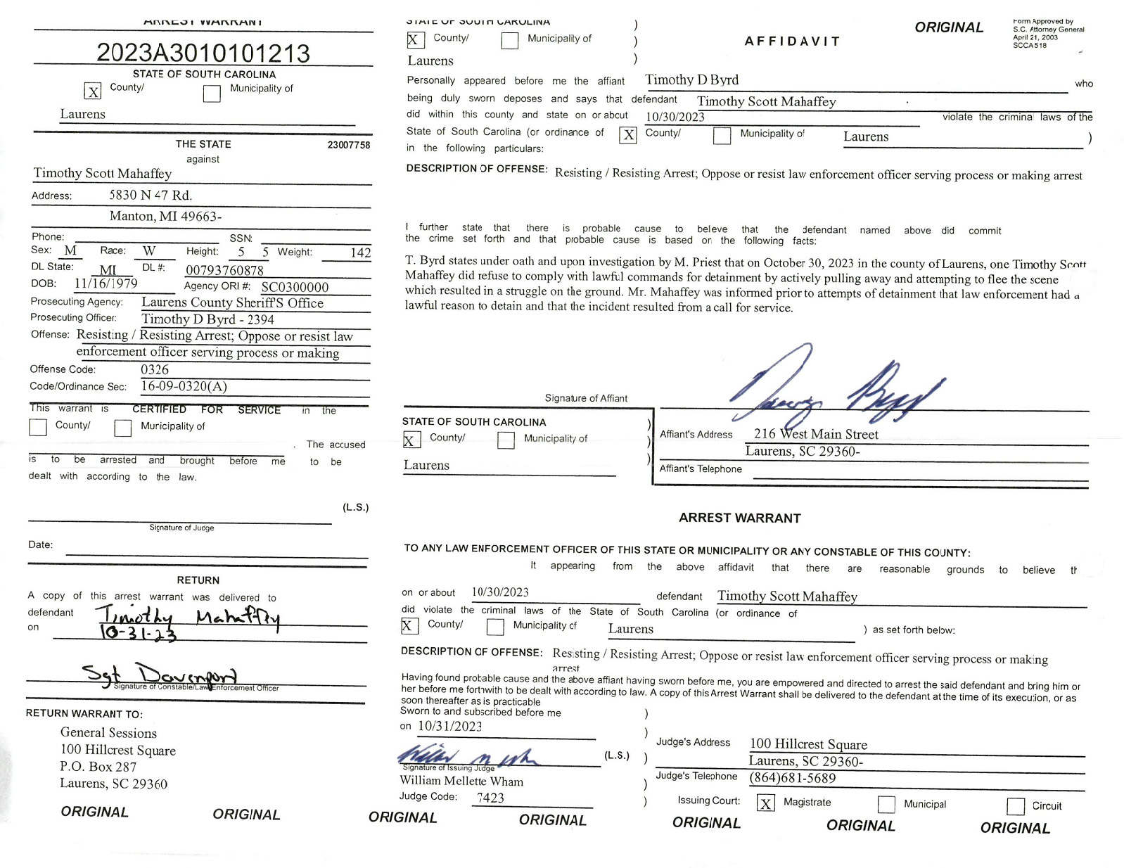 While LCSO Deputy Timothy Byrd swore under oath that Mahaffey resisted arrest, prosecutors in the office of eighth circuit solicitor David Stumbo dropped all charges against the defendant upon reviewing the BWC footage. Mahaffey was subsequently released from jail after fifteen days.