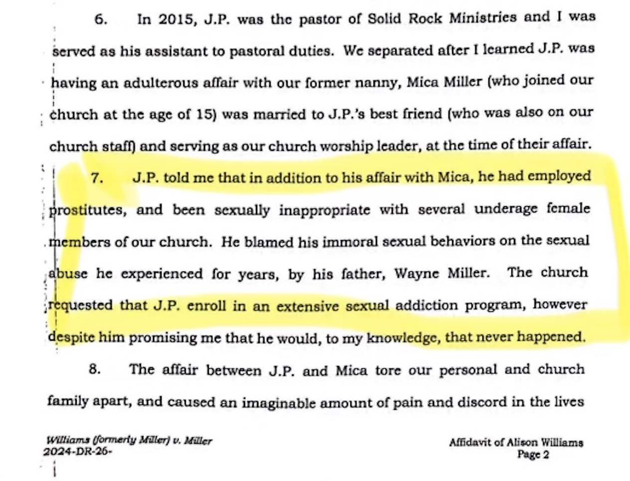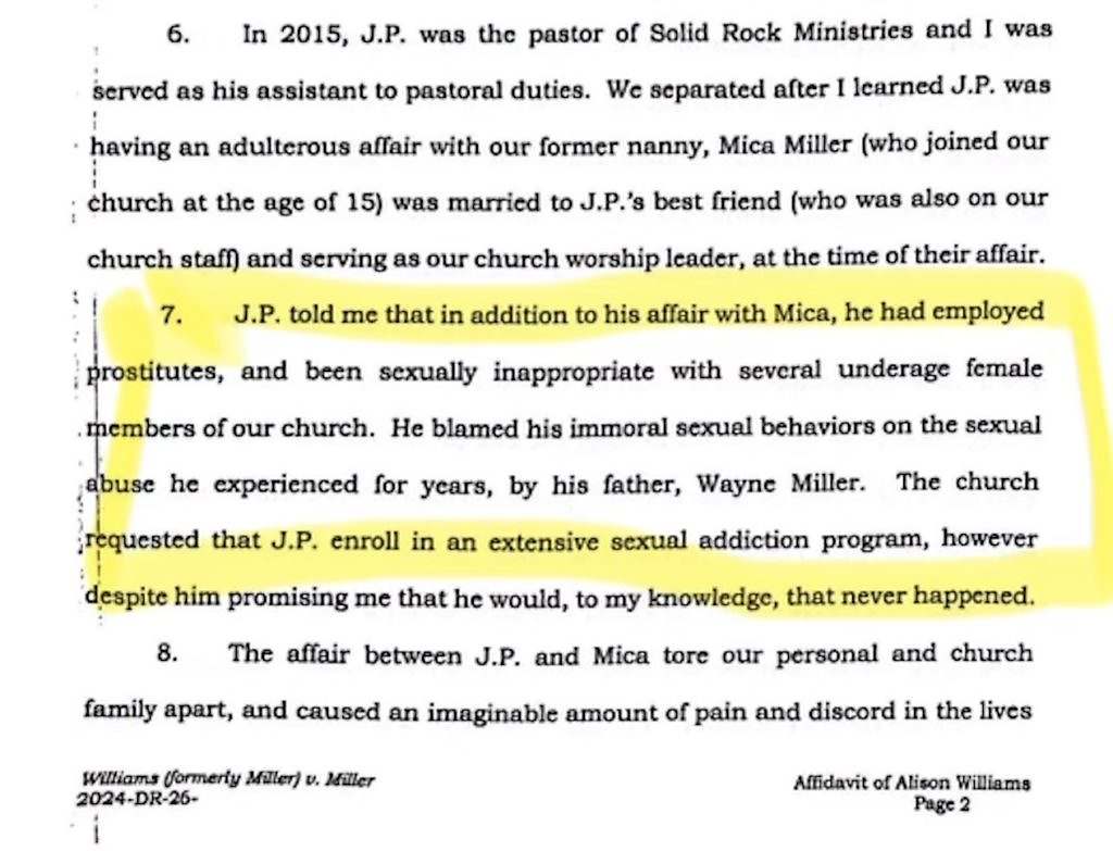 According to Williams’ complaint, she and John-Paul Miller separated after she became aware of his affair with Mica – who had been their family nanny. Mica was married to Miller’s best friend, Jeremy Deas, at the time of the affair. According to her affidavit, John-Paul Miller told his ex-wife that in addition to his affair with Mica, he had “employed prostitutes,” and been “sexually inappropriate with several underage female members” of their church — blaming these “immoral sexual behaviors” on abuse he had allegedly experienced for years at the hands of his father, Reginald “Reg” Wayne Miller.