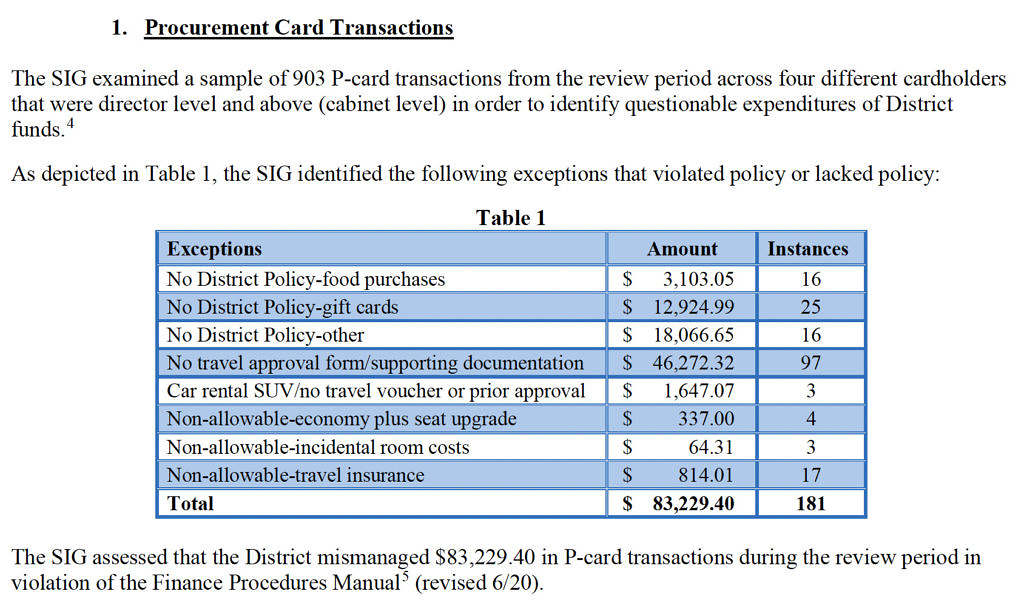 In the scope of its review, SIG investigated P-card transactions within the district budget – revealing a total of more than $83,000 worth of transactions which allegedly violated the district’s regulations on spending.