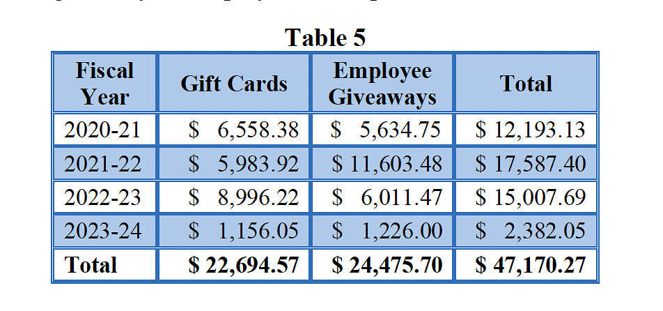 The report further noted the failure of the district to identify a policy relating to the purchase of gift cards with district funds – and procedures governing gifts to employees. Specifically, it identified nearly $23,000 worth of gift cards from fiscal years 2020 to 2024, and nearly $24,500 in employee giveaways during the same five years.