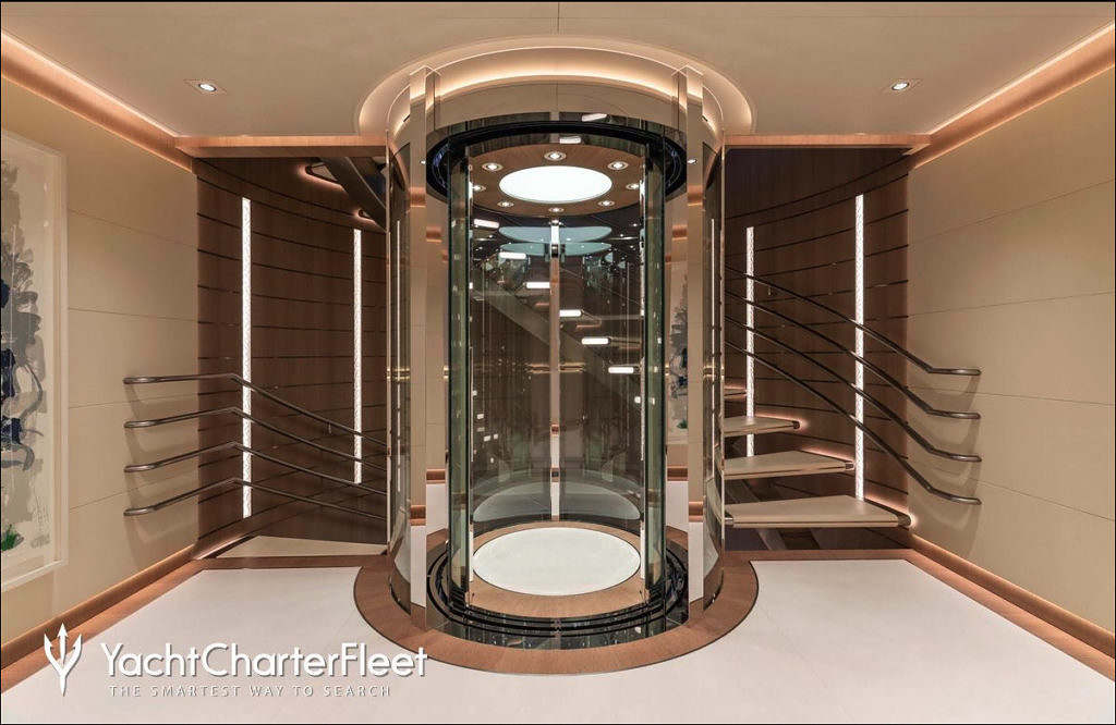 Up to twelve passengers can sleep in seven cabins, and enjoy amenities such as a movie theatre, gym and jacuzzi while cruising at fourteen knots per hour. Once stationary, yachters have access to jet-skis, wake boards, scuba diving equipment, a water jetpack board and numerous other toys.