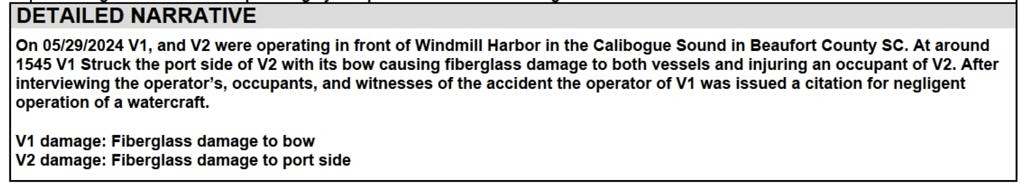 A second individual has been cited in connection with a jet ski accident that occurred on May 29, 2024 near Turner’s Marina in Hilton Head Island, South Carolina. The S.C. Department of Natural Resources (SCDNR) released the accident report this week. It indicated three teenagers were involved in the incident, which occurred in front of the Windmill Harbor in the Calibogue Sound. One of the teens has been charged with negligent operation of a watercraft after the crash sent another teen to the hospital with a broken femur.