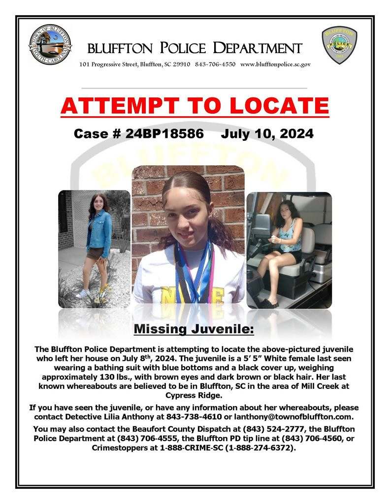 Anyone with information related to the disappearance of the juvenile is encouraged to contact detective Lilia Anthony of the Bluffton police department at 843-738-4610 or via email at lanthony@townofbluffton.com.