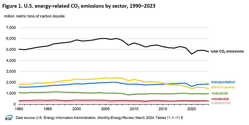 According to the U.S. Energy Information Administration (EIA), energy-related CO2 emissions in our nation declined to 4.8 billion metric tons in 2023 – well below their peak of more than 6 billion metric tons in the early 2000s.