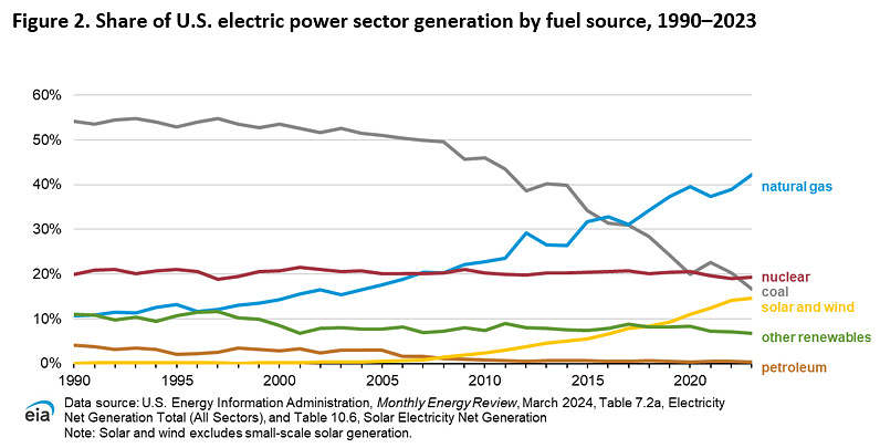 “These reductions were caused largely by reduced coal-fired electricity generation, as natural gas and solar power made up a larger portion of the generation mix,” the agency noted. “This change in the generation mix away from coal, which has the highest carbon intensity among fossil fuels, decreased electric power sector CO2 emissions by 7 percent relative to 2022.”