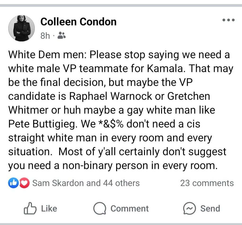 “White Dem men: Please stop saying we need a white male VP teammate for Kamala,” Condon wrote on their Facebook page this week. “We *&$% don’t need a cis straight white man in every room and every situation.” Most of y’all certainly don’t suggest you need a non-binary person in every room.”