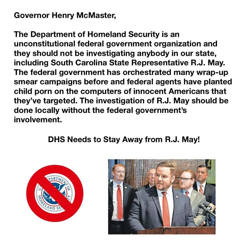 “The states never gave the federal government authority to create DHS in the U.S. Constitution,” he wrote, urging his audience to contact governor Henry McMaster and deliver the following message about “wrap-up smear campaigns” which “planted child porn on the computers of innocent Americans.”