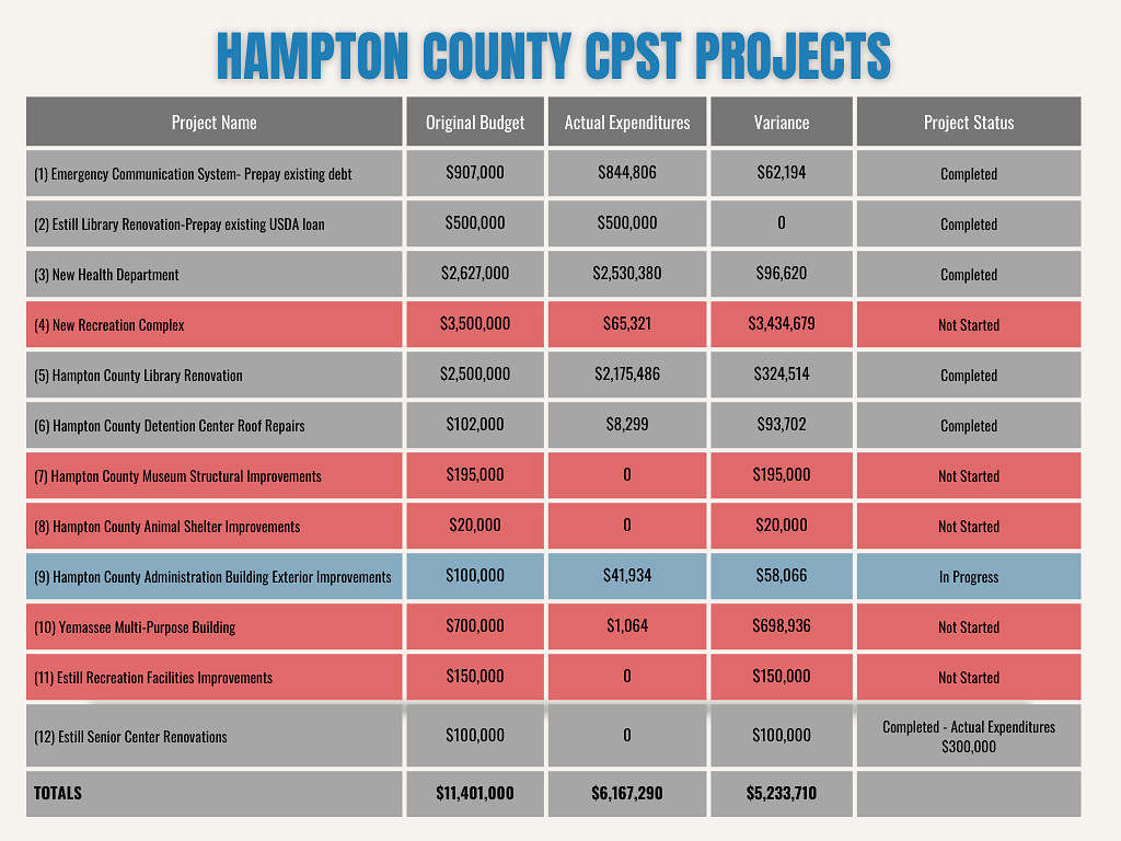 How did we get here? In 2012, Hampton County voters approved a referendum imposing a new one percent local sales and use tax for a period of eight years – beginning on May 1, 2013 and continuing through June 30, 2021. A total of $11.21 million was collected by the county and, per state law, was supposed to be devoted towards capital projects such as roads, bridges, public facilities, recreation facilities and water and sewer projects.