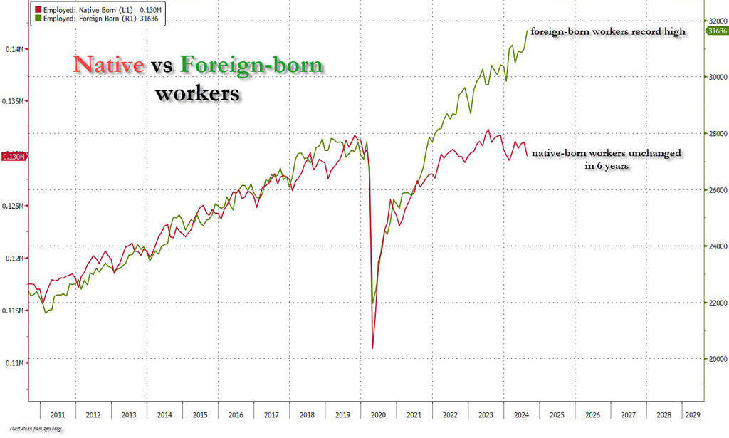 “While the quality of job gains in the past year has clearly been catastrophic – a necessary condition to give the impression that headline, or quantitative, job growth was strong – there was a very clear reason for that, and it goes back to what we have been pounding the table on in the past: The reason is the continued replacement of native-born workers with immigrants (some legal but mostly illegal),” Zero Hedge concluded. “It is anything but a theory: it is cold hard fact.”