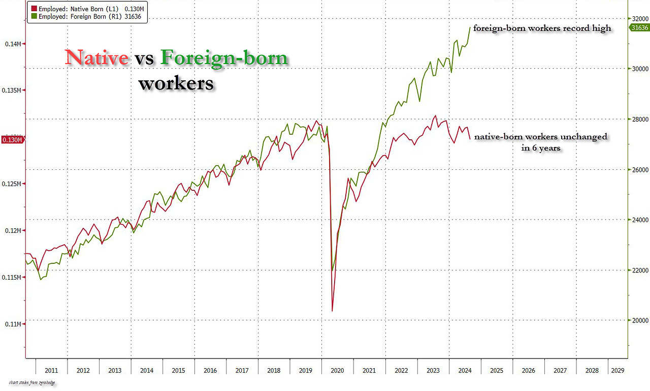 “While the quality of job gains in the past year has clearly been catastrophic – a necessary condition to give the impression that headline, or quantitative, job growth was strong – there was a very clear reason for that, and it goes back to what we have been pounding the table on in the past: The reason is the continued replacement of native-born workers with immigrants (some legal but mostly illegal),” Zero Hedge concluded. “It is anything but a theory: it is cold hard fact.”