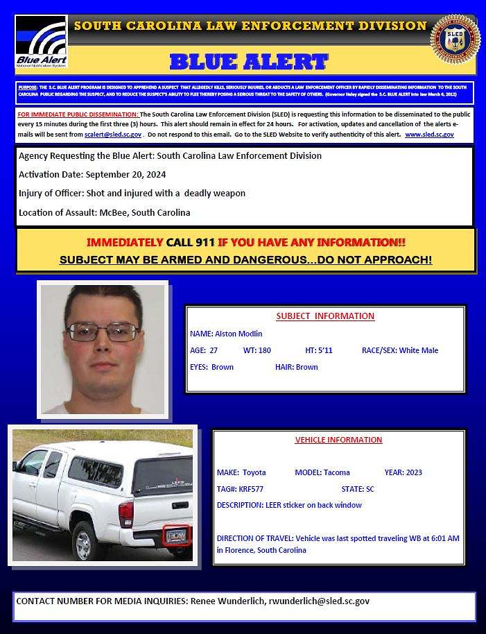 Agents of the South Carolina State Law Enforcement Division (SLED) issued an “SC Blue Alert” after a police officer in the town of McBee was shot during a traffic stop earlier this week.