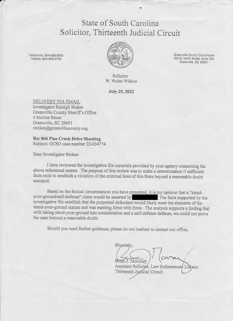 “The facts supported by the investigative file establish that the purported defendant would likely meet the elements of the stand-your-ground statute and was meeting force with force,” wrote Assistant Solicitor Brian Moroney on July 29, 2022.