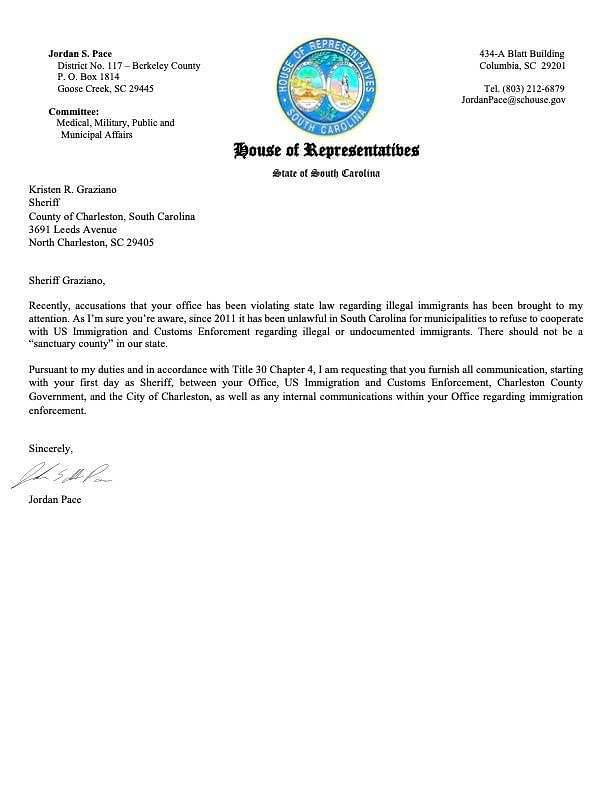 “Recently, accusations that your office has been violating state law regarding illegal immigrants have been brought to my attention,” Pace wrote. “As I’m sure you’re aware, since 2011 it has been unlawful in South Carolina for municipalities to refuse to cooperate with (ICE) regarding illegal or undocumented immigrants.”