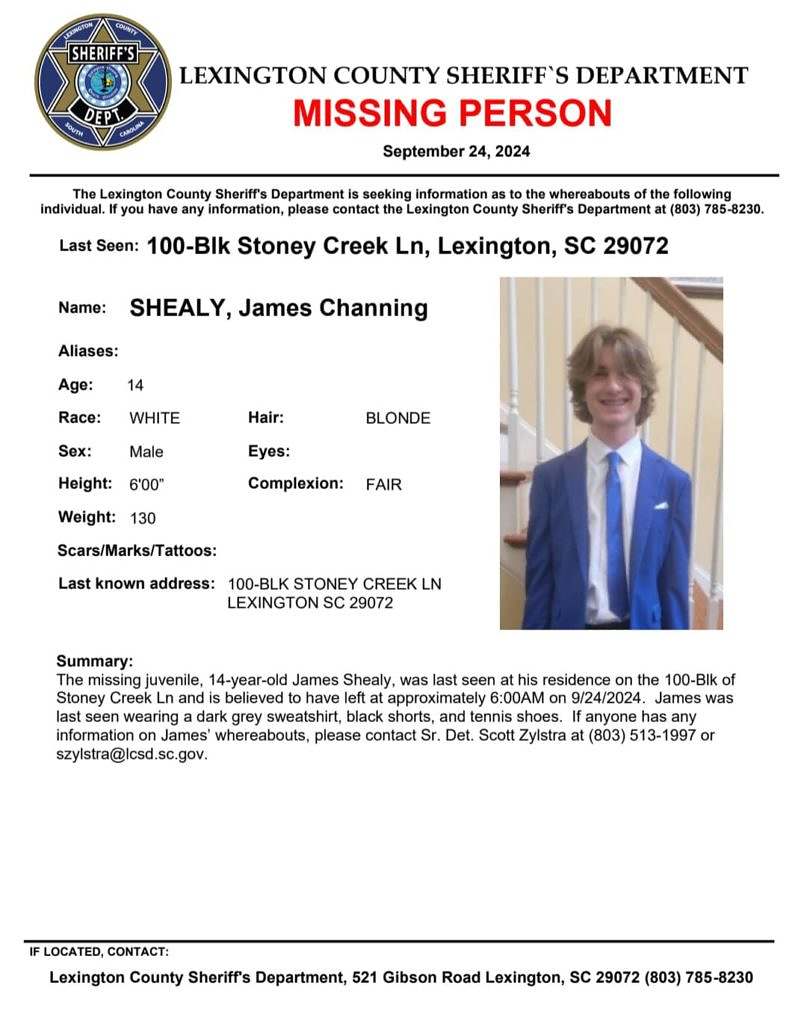 As we reported yesterday, Shealy was last seen sometime between 5:30 a.m. and 6:00 a.m. EDT on Tuesday (September 24, 2024) off of Wise Ferry Road just south of Lake Murray. The fourteen-year-old from Lexington, S.C. was reportedly wearing “a dark grey, almost charcoal” colored hoodie, black shorts and tennis shoes when he went missing.
