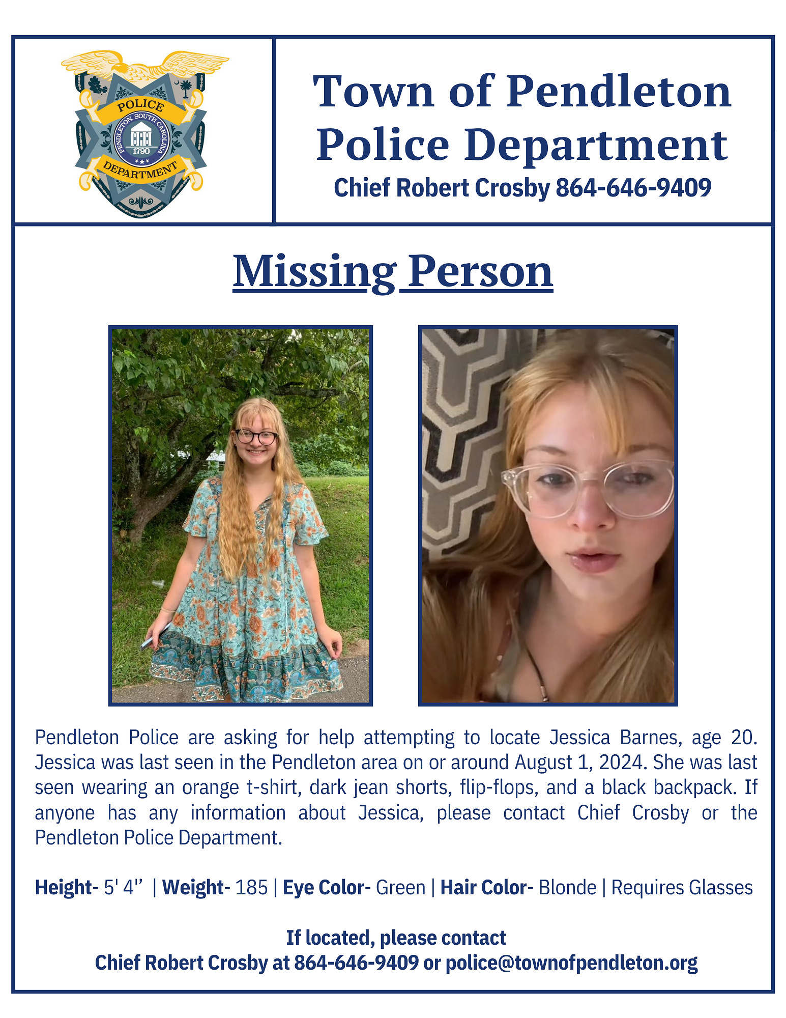 Anyone with information regarding the whereabouts of Jessica Barnes is encouraged to contact Robert Crosby at 864-646-9409 or via email at robertc@townofpendleton.org. Tips may also be submitted to SLED at tips@sled.sc.gov.