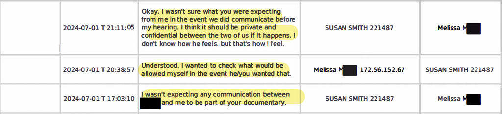 Some of the messages are heavily redacted, but a message sent on June 4, 2024 indicated Smith was responding to Melissa’s questions. Though no response to the questions is seen in the messages provided, Melissa indicated she would be receiving a letter in the mail from Smith on June 10, 2024.