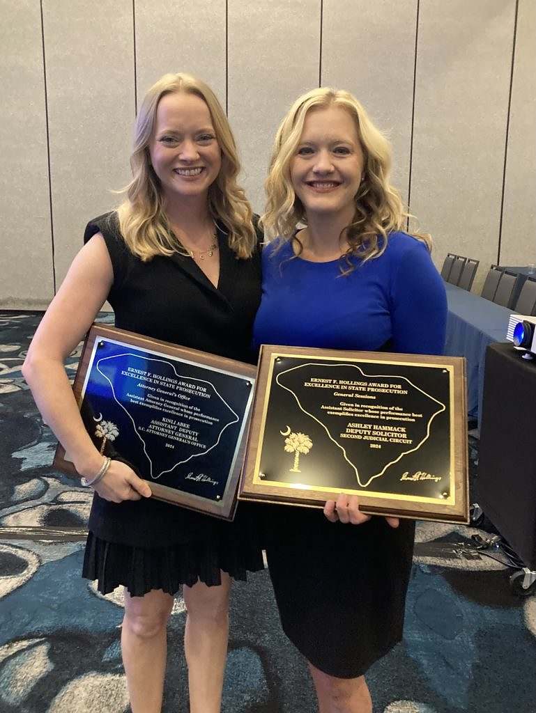 Per the release, deputy solicitor Ashley Hammack of the S.C. second judicial circuit and assistant attorney general Kinli Abee were honored as the 2024 recipients of the Ernest F. Hollings awards for excellence in state prosecution. The Hollings’ awards – which recognize “excellence and achievement in the criminal justice system” – were previously announced at the S.C. Solicitors’ Conference in Myrtle Beach, S.C. earlier this month.