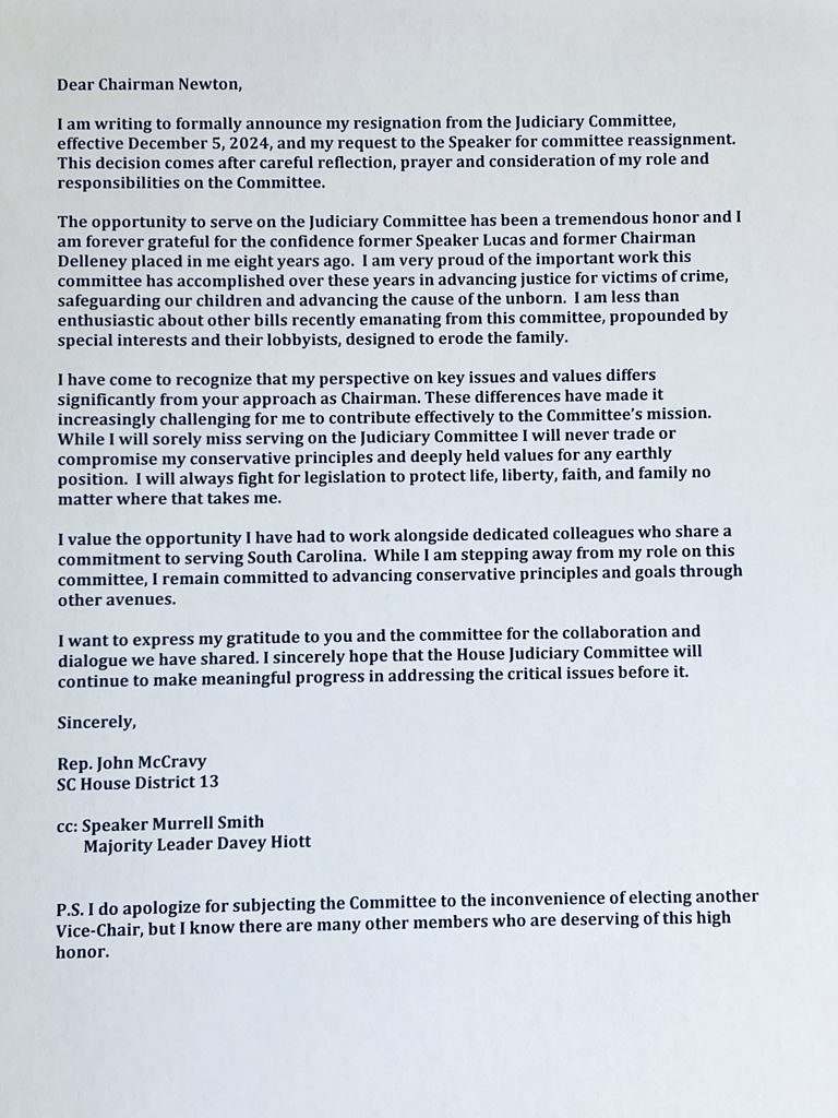 State representative John R. McCravy III of Greenwood, S.C. submitted a letter to the chairman of the committee – Weston Newton of Bluffton, S.C. – on Thursday (December 5, 2024) resigning his vice chairmanship effective immediately. According to McCravy, his decision was motivated by concern over the direction of the panel and the “special interests” and “lobbyists” allegedly pulling its strings.