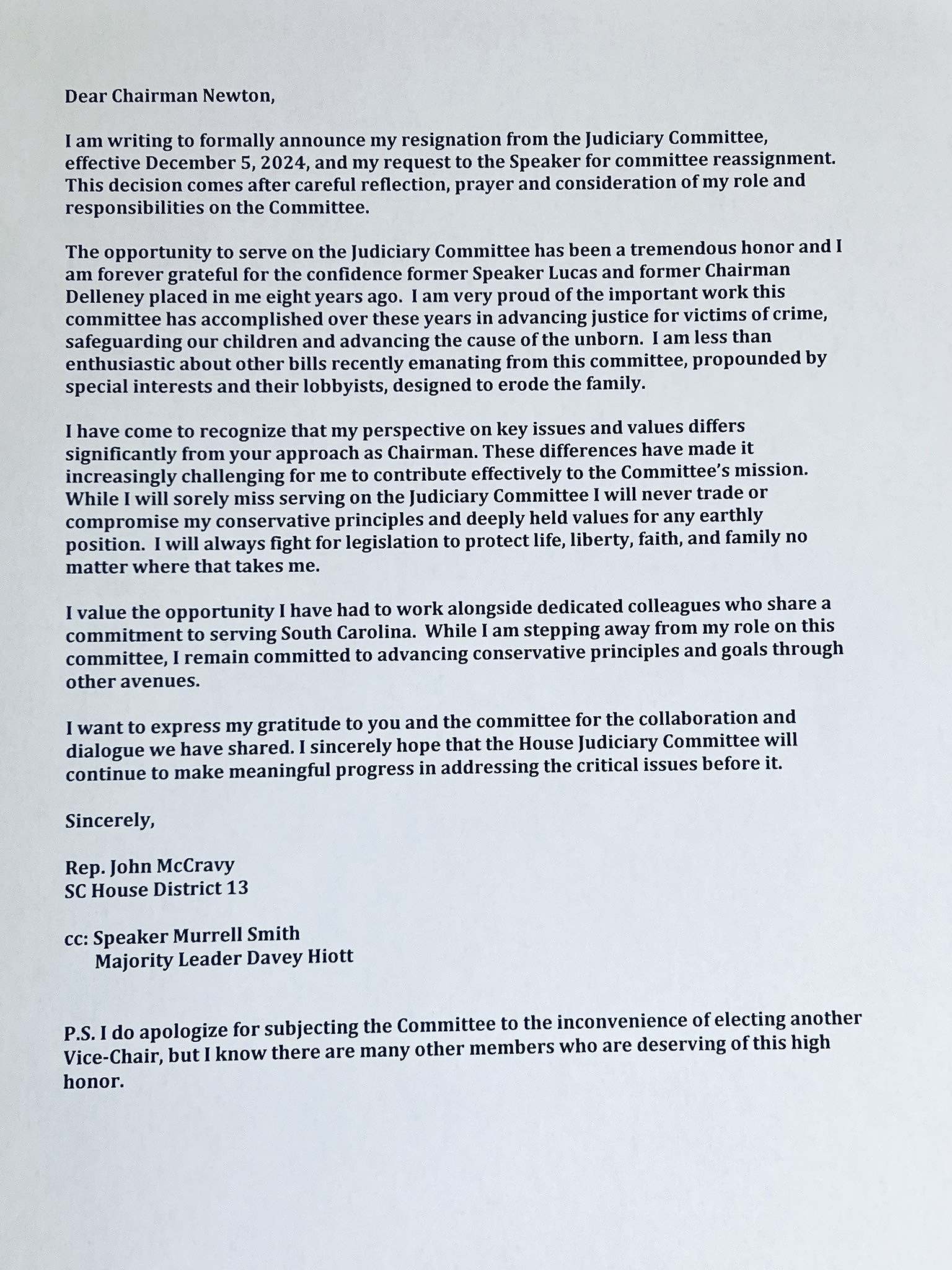 “I am very proud of the important work this committee has accomplished over these years in advancing justice for victims of crime, safeguarding our children and advancing the cause of the unborn,” McCravy wrote to Newton. “I am less than enthusiastic about other bills recently emanating from this committee, propounded by special interests and their lobbyists, designed to erode the family.”