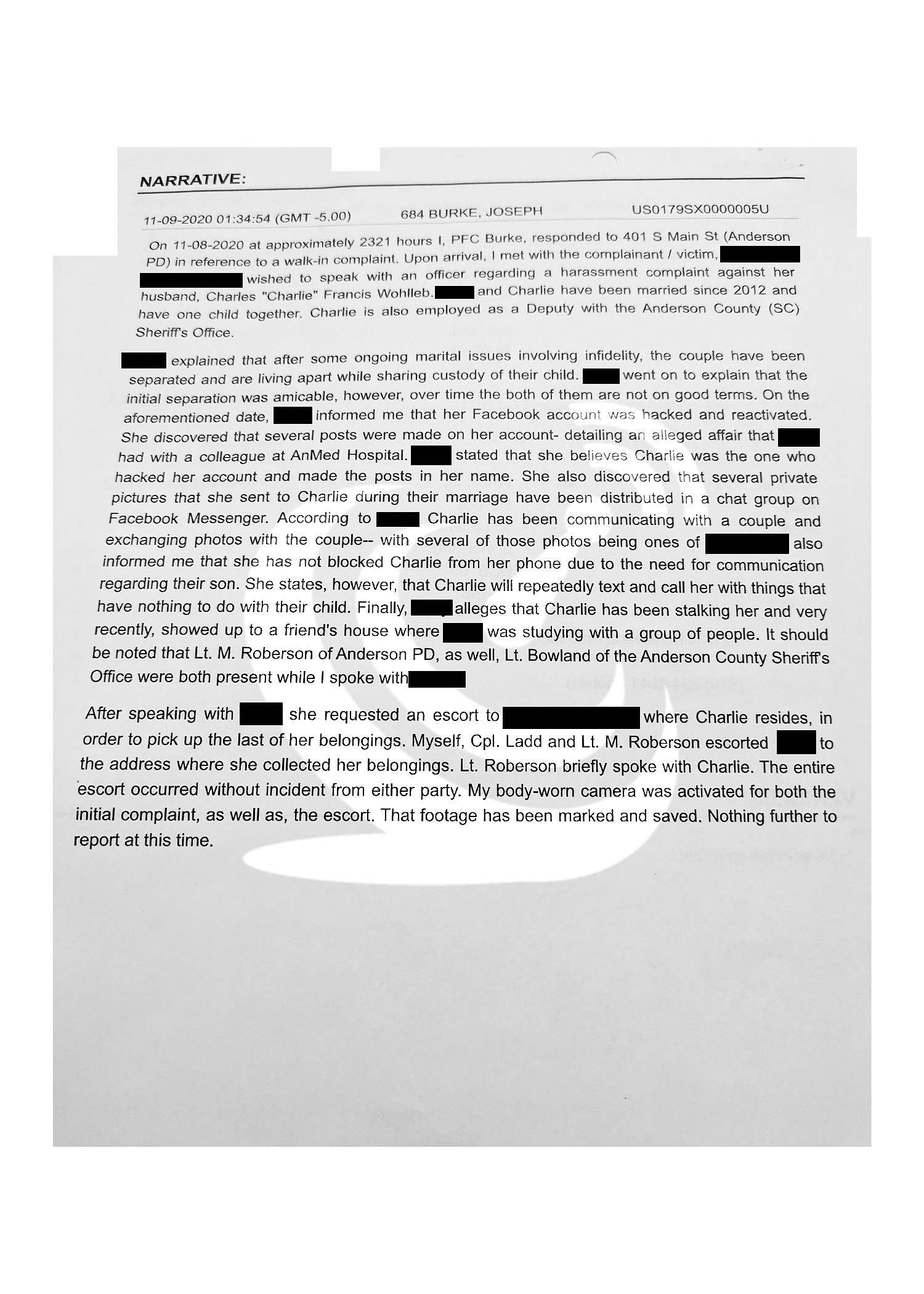 “Several posts were made on her account, detailing an alleged affair,” noted yet another responding officer. “She also discovered that several private pictures, sent to (Wohlleb) during their marriage, were distributed in a group chat on Facebook Messenger (sic).”