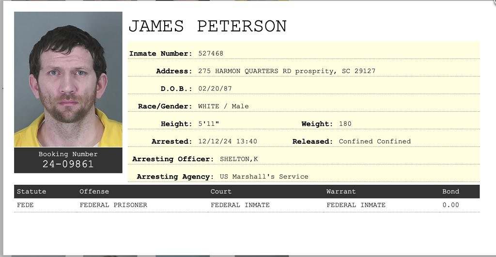 Peterson has been in custody since his arrest on June 21, 2024. He was recently transferred to the Spartanburg Detention Center on December 12, 2024 where he is considered a federal prisoner.