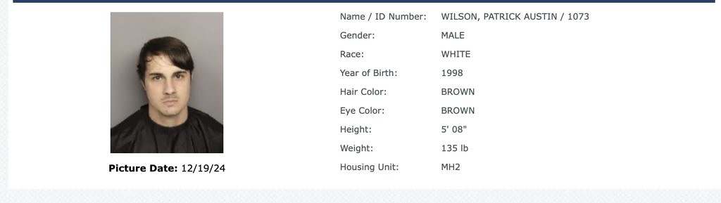 Patrick Austin Wilson, 26, of Brunson, South Carolina, remains in custody at the Greenville County detention center following his arrest on Thursday (December 19, 2024) for failure to appear in court. Wilson is facing pending charges in Greenville and Hampton counties including larceny, receiving stolen goods and drug possession.