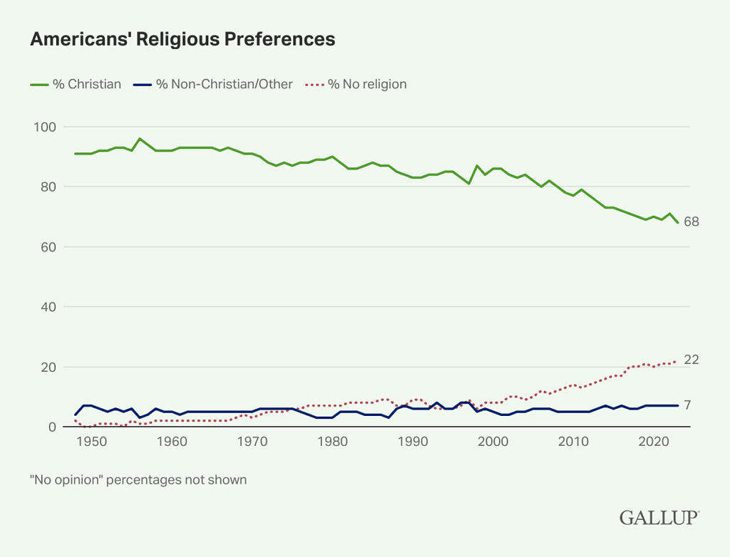 Last spring, Gallup published its annual report on the religious preferences of American adults, finding 68% of them identified as Christians compared to 22% who did not identify with any religion. Just a quarter century ago, 87% identified as Christians compared to 6% percent who did not identify with any religion.