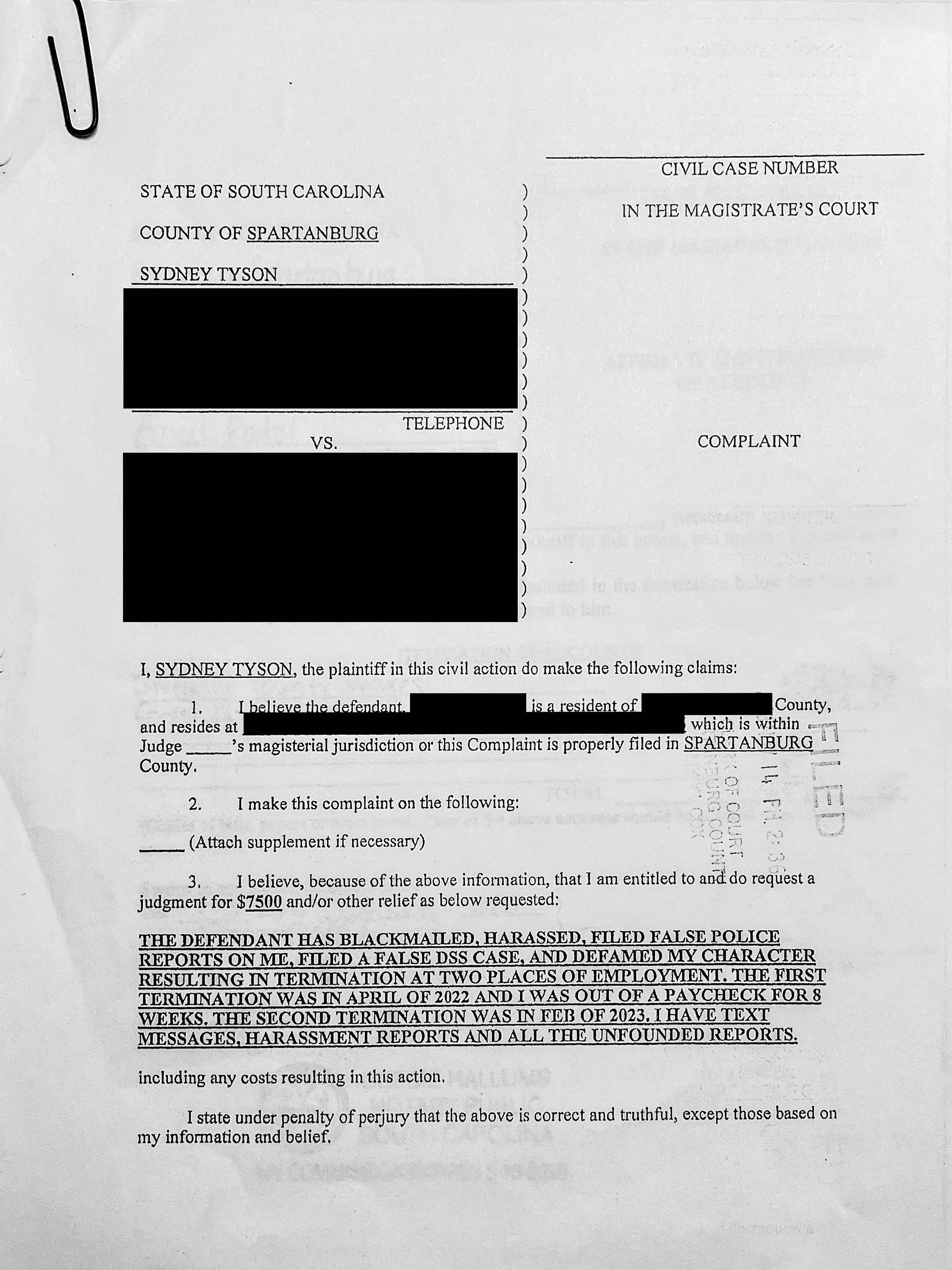 Citing interviews conducted by SLED, Spartanburg County traffic court supervisor Aimee Freeman claimed Tyson’s money drawer was “frequently” short on cash. According to a lag quarter wage request Tyson filed, her employment with traffic court lasted a mere five months.