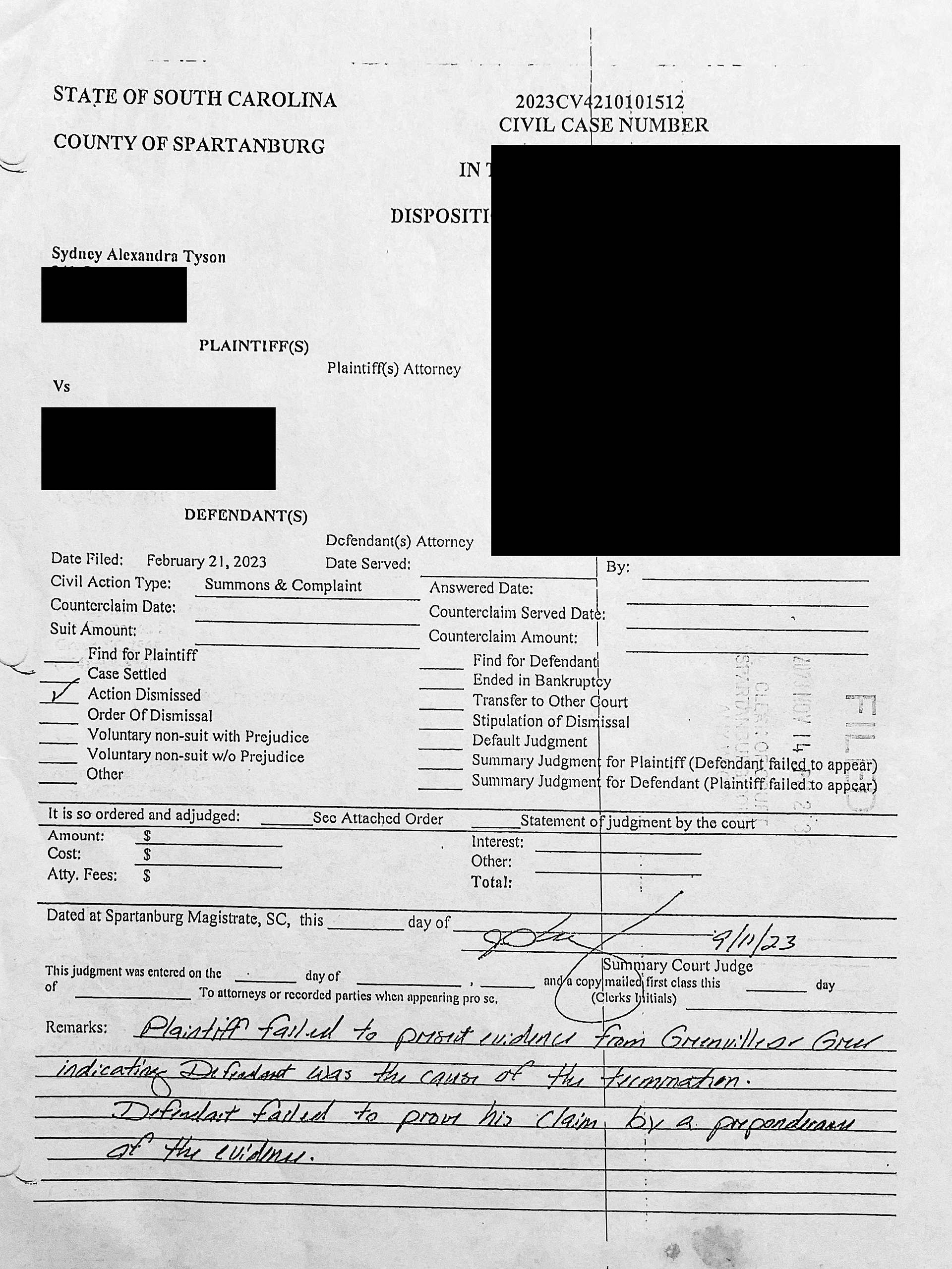 Much to her chagrin, Spartanburg County magistrate James D. Willingham dismissed the case after seven months of litigation. Citing his written remarks, Tyson “failed to present evidence from Greenville or Greer indicating defamation was the cause of the termination.”