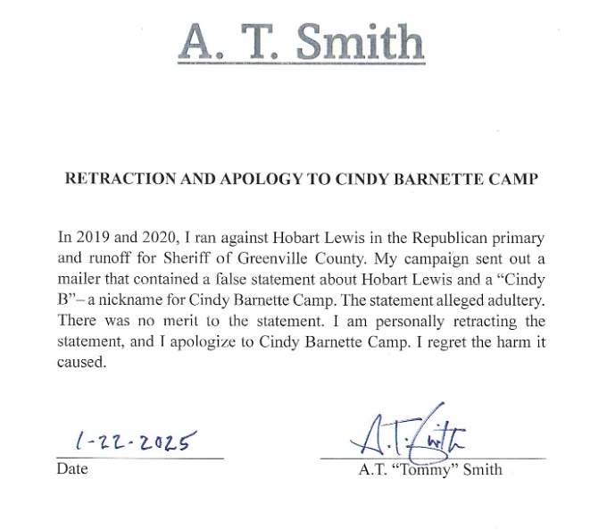 “Cindy never had anything but a professional relationship with Hobart Lewis – and this was when they worked in Greer more than twenty (20) years ago,” Churdar said in a statement (.pdf). “Hobart Lewis was Cindy’s supervisor. They were never alone – even in a patrol car. At the time A.T. Smith made these desperate allegations, Cindy was living in Anderson. She was completely uninvolved with this campaign, and she did not deserve to get dragged into it by A.T. Smith.”