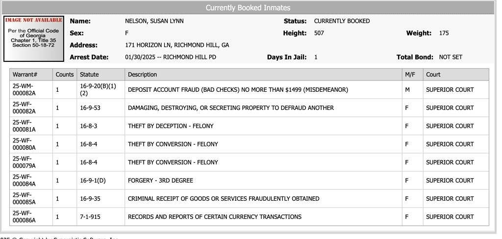 Susan Lynn Nelson, 44, of Richmond Hill, Georgia, was incarcerated at the Bryan County detention center, with bond yet to be set. She faces eight charges related to defrauding individuals in this scheme and others, including a misdemeanor charge for issuing bad checks totaling less than $1,499. The felony charges against her include: