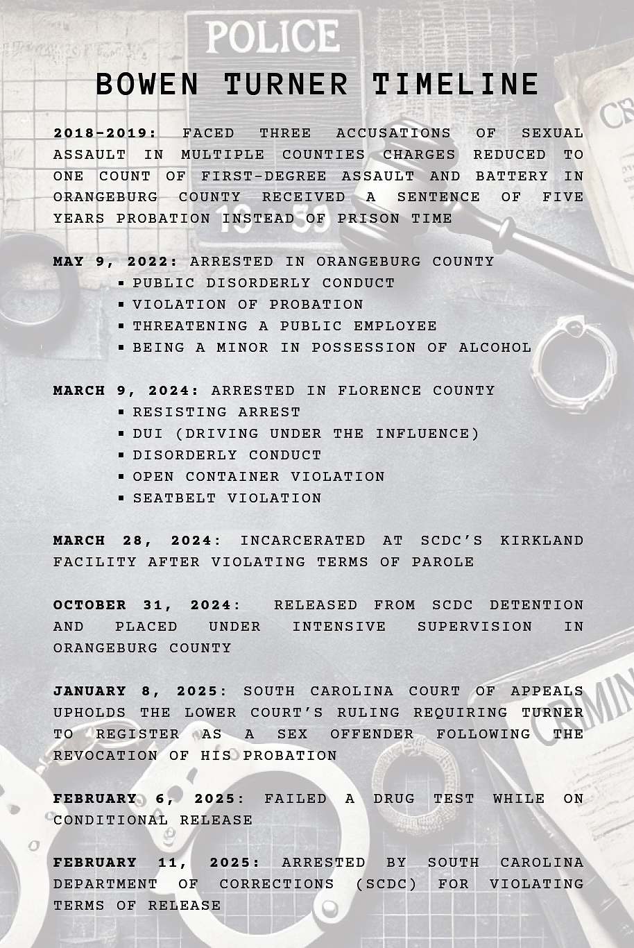 CRIME & COURTSBowen Turner Arrested for Violating Conditional Release, Failing Drug Test“Fortunate son” back behind bars… by Callie LyonsFebruary 14, 2025February 17, 20253 Getting your Trinity Audio player ready... At the tender age of 22, South Carolina “fortunate son” Bowen Turner has amassed a crimiYou must Subscribe or log in to read the rest of this content.