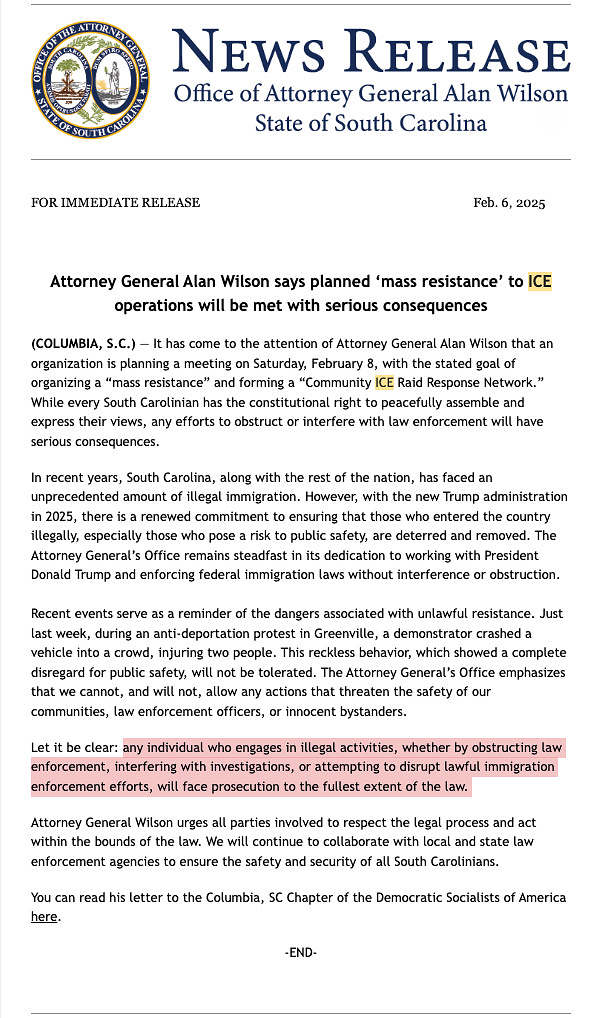South Carolina attorney general Alan Wilson issued a statement at the beginning of president Donald Trump‘s second administration indicating “any individual who engages in illegal activities, whether by obstructing law enforcement, interfering with investigations, or attempting to disrupt lawful immigration enforcement efforts, will face prosecution to the fullest extent of the law.”