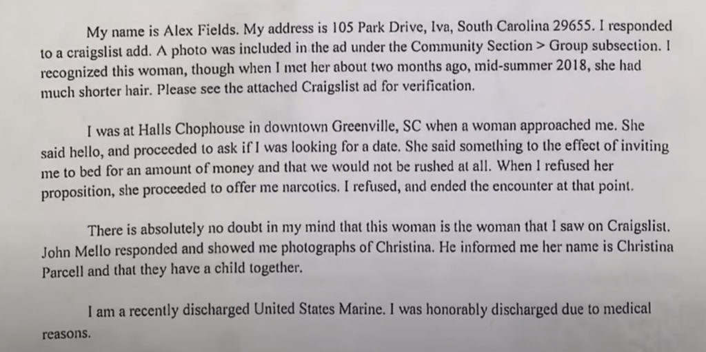 The affidavit was obtained in response to advertisements Mello had placed on CraigsList seeking information about Parcell.