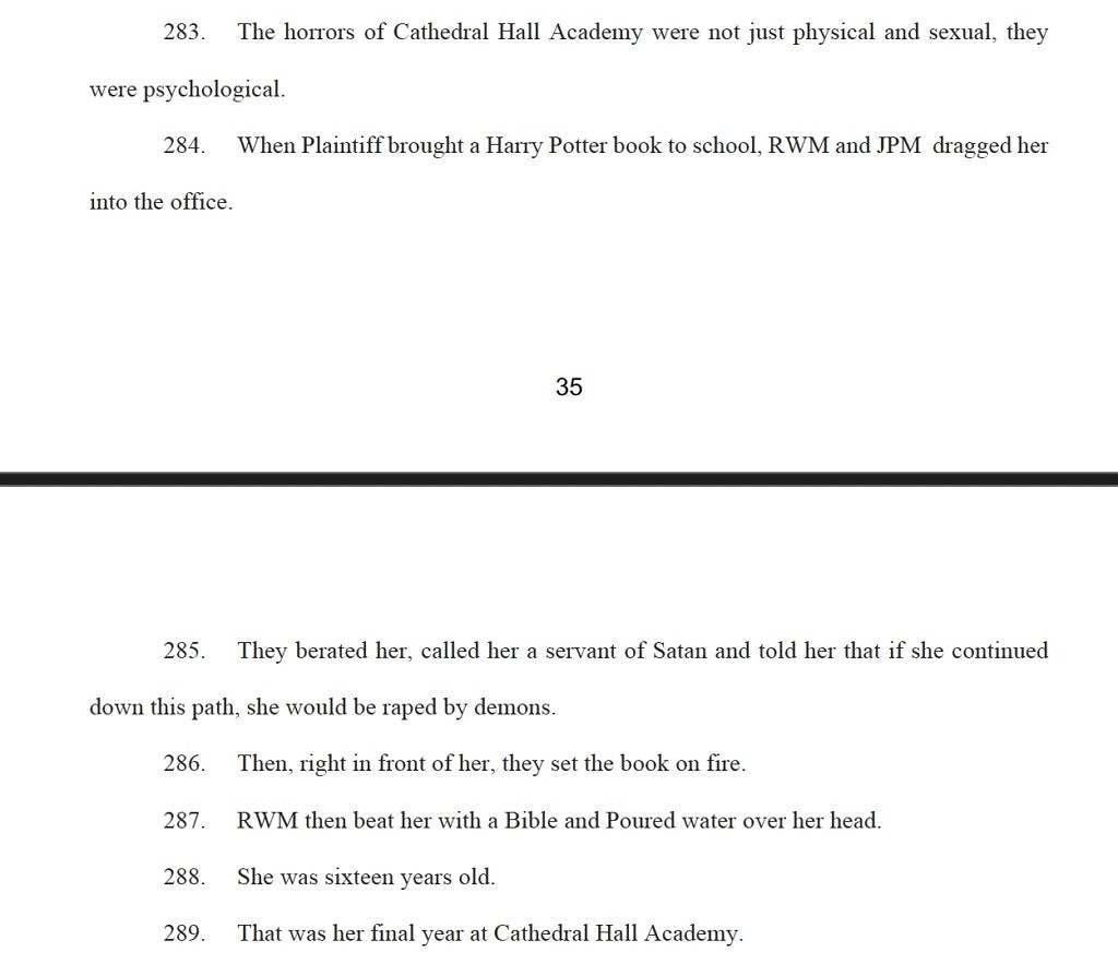 According to the filing, at age sixteen the young girl was told she was a “servant of Satan” – and that she would be “raped by demons.” As punishment, she was beaten with a Bible and water was poured over her head, the complaint alleged.