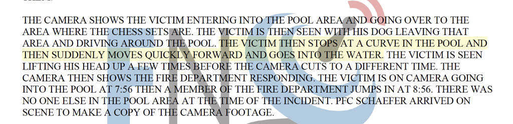 The coroner’s report narrative also differs from MBPD’s narrative — the coroner indicates the wheelchair got too close to pool and the wheel slipped whereas the narrative in the report from MBPD indicates his chair lunged suddenly into the pool.
