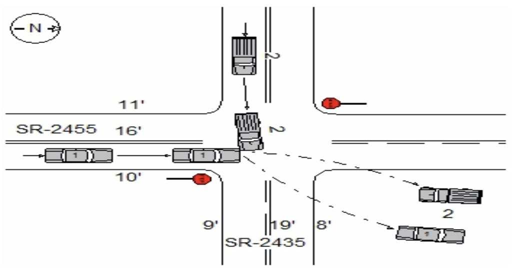 “VEHICLE 1 WAS TRAVELING NORTH ON SR 2455. VEHICLE 2 WAS TRAVELING EAST ON SR 2435. VEHICLE 1 DISREGARDED THE STOP SIGN AND COLLIDED WITH VEHICLE 2, EJECTING THE DRIVER OF VEHICLE 2. AFTER IMPACT, VEHICLE 1 RAN OFF THE ROAD TO THE RIGHT, AND CAME TO REST OUT OF THE ROADWAY FACING NORTH. VEHICLE 2 CROSSED THE CENTERLINE, RAN OFF THE ROAD TO THE LEFT, AND CAME TO REST OUT OF THE ROADWAY FACING SOUTH.”