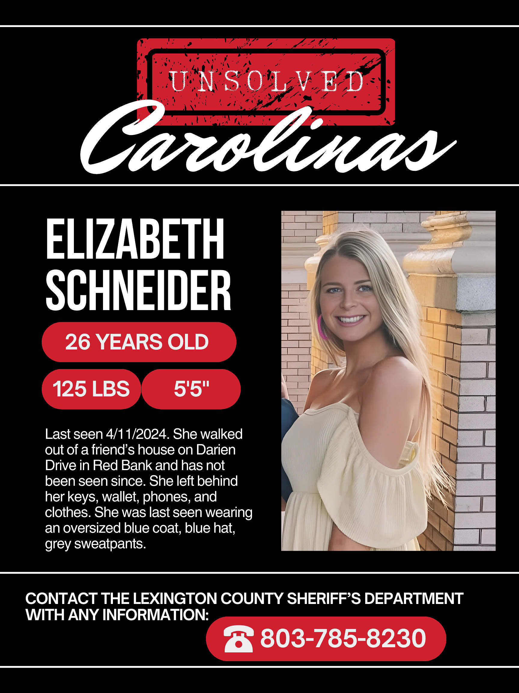 Anyone with information regarding Elizabeth Schneider’s whereabouts is urged to contact LCSD at 803-785-8230 or reach out through www.crimedesk.tips.