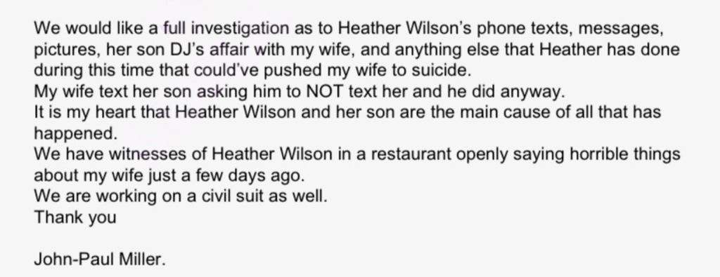 Miller asked police to investigate Wilson’s “phone texts, messages, pictures, her son DJ’s affair with my wife and anything else that Heather has done during this time that could’ve pushed my wife to suicide.”