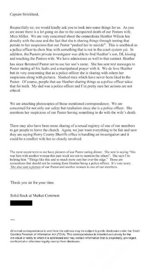 “We are concerned for not only our safety but retaliation since she is a police officer,” Ross wrote. “She is very suspicious of our Pastor having something to do with the wife’s death.”