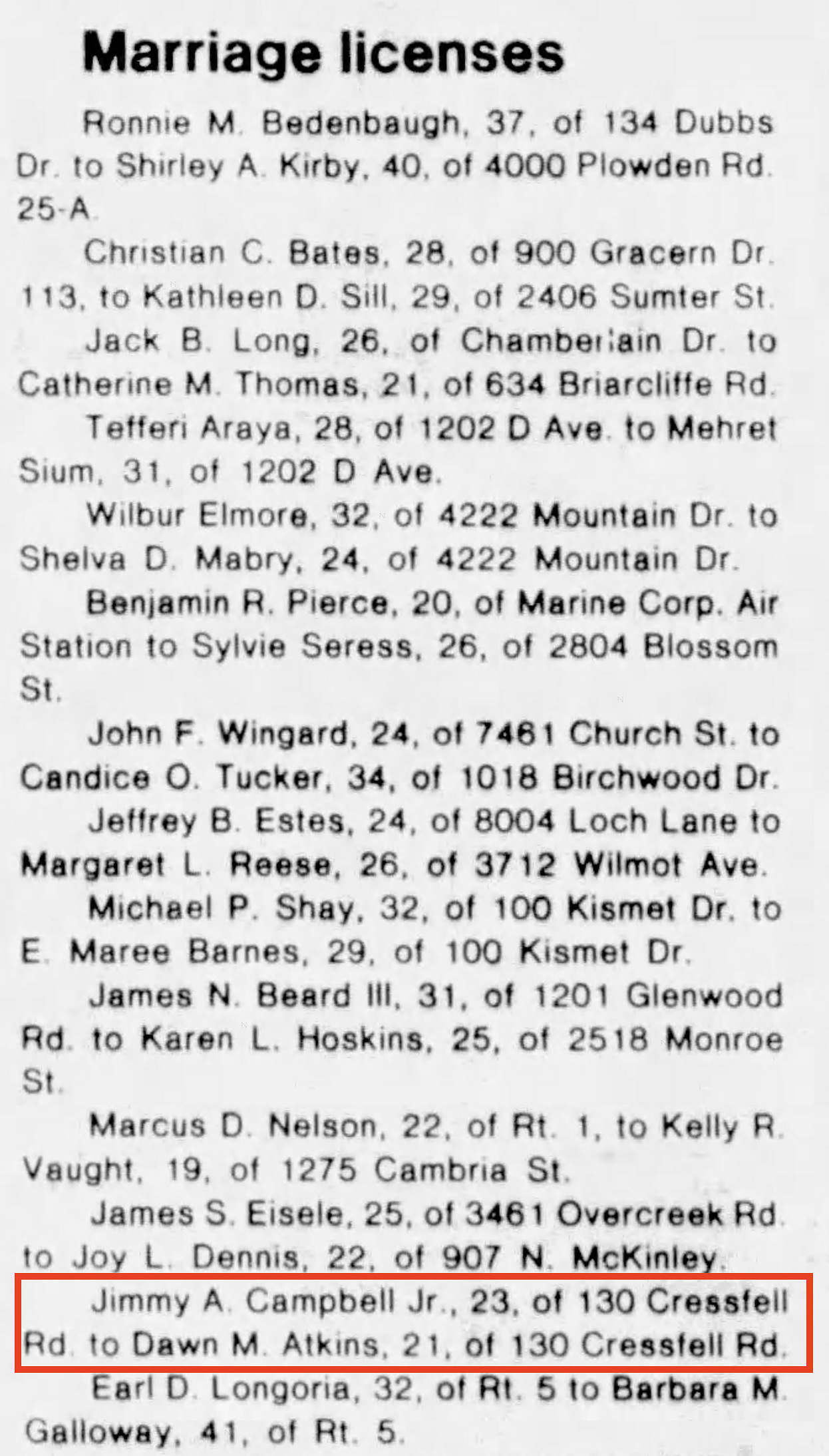 Campbell had already amassed a significant criminal record – including the 1982 assault of a Richland County school secretary that landed him in the custody of the S.C. Department of Corrections (SCDC) for eight years. Evidence of the Atkins/Campbell nuptials was found in a newspaper announcement. They divorced in 1989 – while Campbell was still incarcerated.