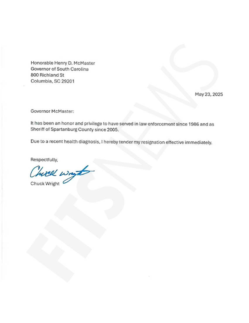 “It has been an honor and a privilege to have served in law enforcement since 1986 and as sheriff of Spartanburg County since 2005,” Wright wrote in the letter provided to FITSNews. “I hereby tender my resignation effective immediately.”