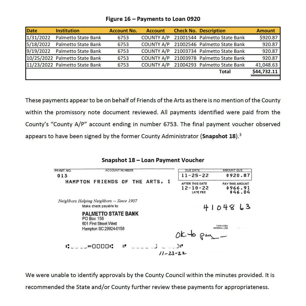 - Hampton County made five direct payments to ‘Friends of the Arts’ group totaling $44,732 to cover a nonprofit’s private bank loan, including a final loan payoff of more than $41,000. The funds were disbursed from the county’s accounts and approved by the former administrator.