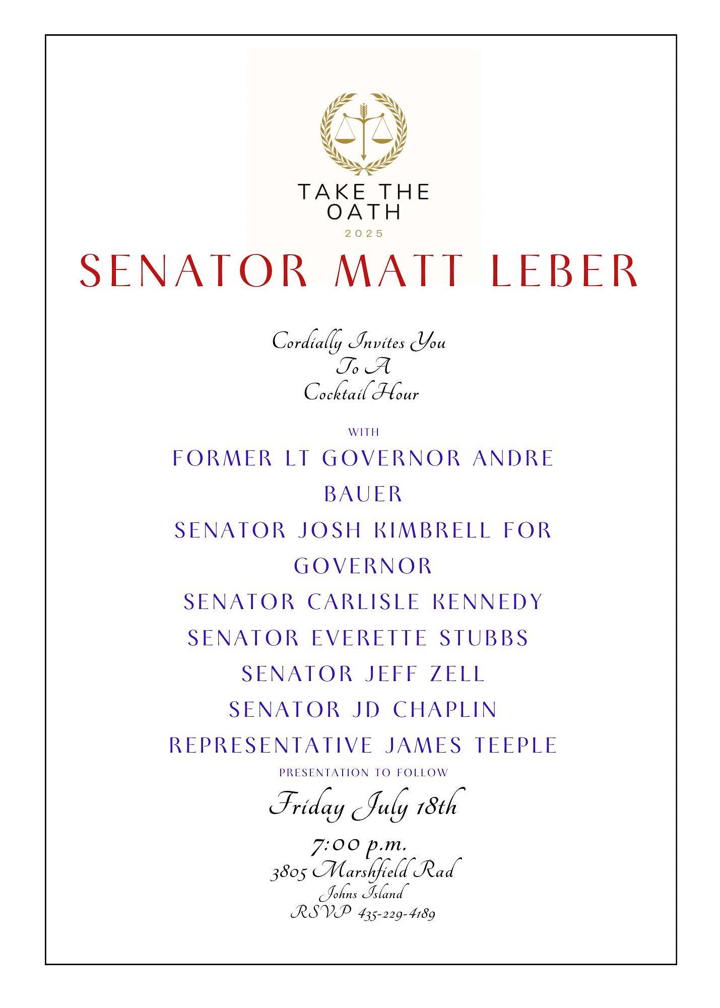The launch of Leber’s PAC was held on July 18, 2025 – and included an appearance by former S.C. lieutenant governor and U.S. Senate candidate André Bauer, along with endorsements from state senators JD Chaplin, Carlisle Kennedy, Josh Kimbrell, Everette Stubbs and Jeff Zell and state representative James Teeple.