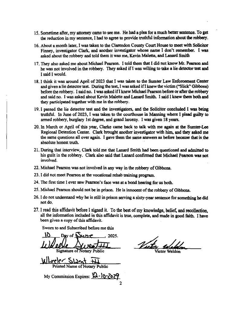 The timing only deepens the injustice. Pearson filed his own handwritten application for post-conviction relief from prison on June 7, 2024 – unaware solicitor Finney’s office had been negotiating with Weldon a full year earlier. By July 2023, Weldon had already pleaded guilty, and prosecutors had been presented with evidence confirming Pearson’s innocence. In November 2023, after Pearson passed a polygraph test, investigators told him they believed he was not involved. Yet even then, details of Weldon’s statements and supporting affidavits were not disclosed until well after Pearson’s filing.