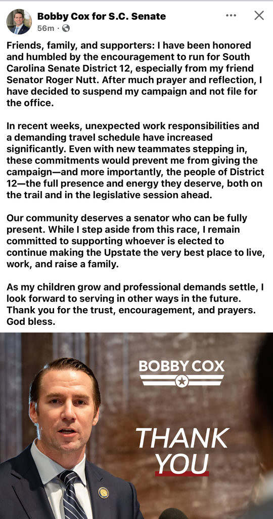“Friends, family, and supporters: I have been honored and humbled by the encouragement to run for South Carolina Senate District 12, especially from my friend Senator Roger Nutt,” Cox wrote in a Facebook post on his campaign page. “After much prayer and reflection, I have decided to suspend my campaign and not file for the office.”