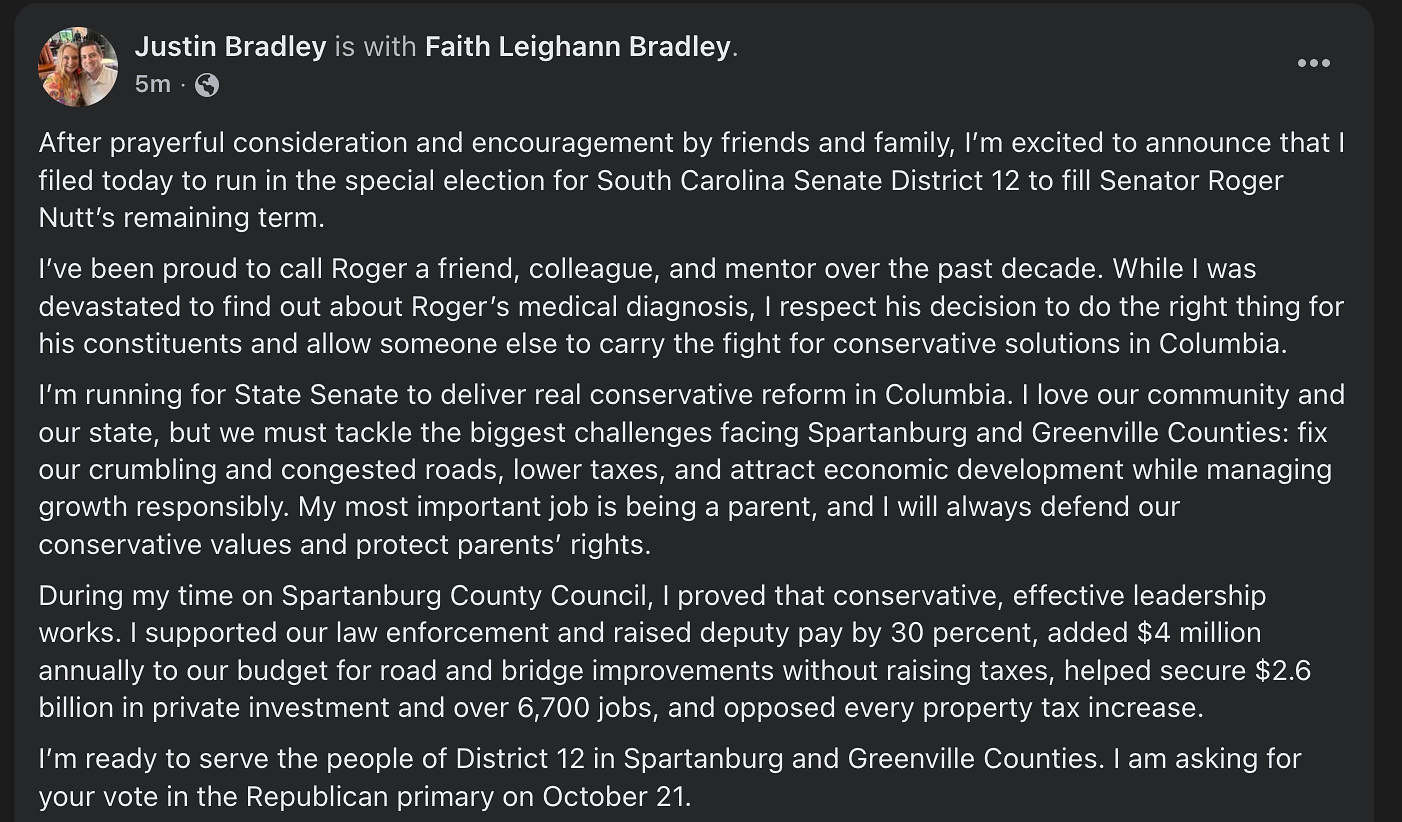 On Wednesday afternoon (September 3, 2025), Spartanburg County councilman Justin Bradley joined the race to fill the remainder of Nutt’s term. In a Facebook post announcing his bid, Bradley reflected on his time serving alongside Nutt as a councilman – and commended his decision to relinquish his seat in light of his illness.