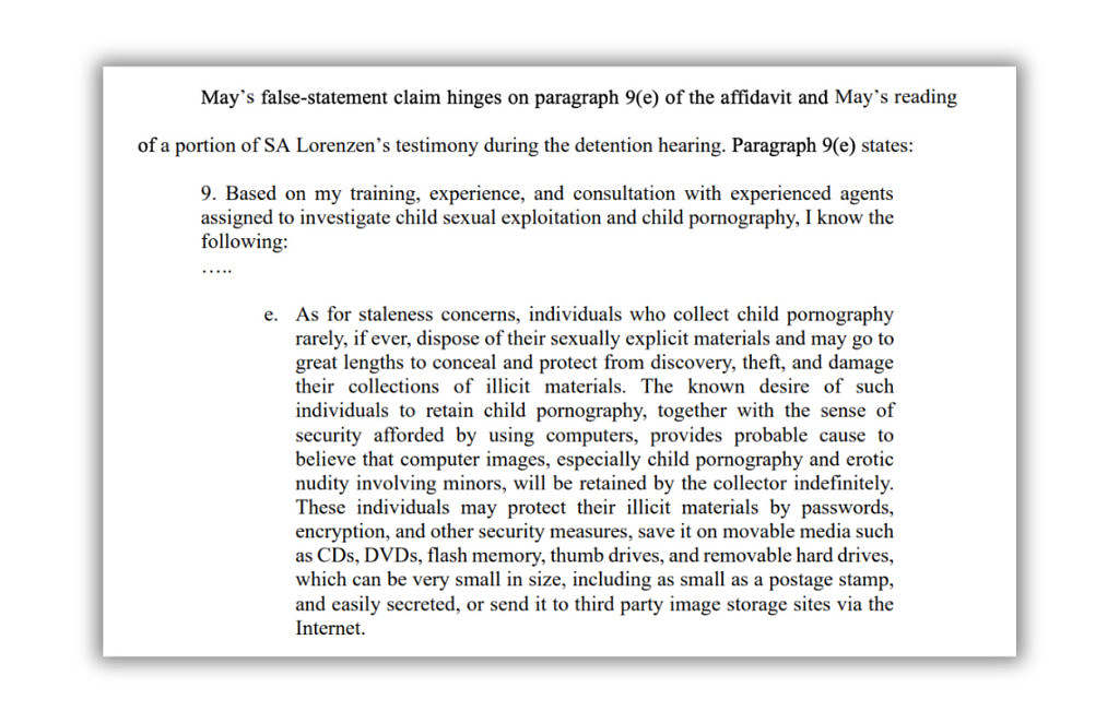 The government maintained May’s argument rests on a mischaracterization of Lorenzen’s testimony. At issue is her affidavit statement that collectors of child pornography “rarely, if ever, dispose” of their material — contrasted with her detention hearing testimony that it is “very, very common” for search warrants to yield no CSAM artifacts.
