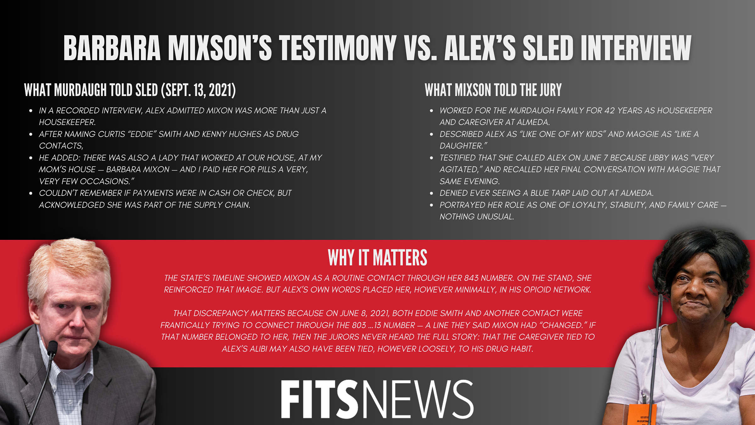 If the mysterious number was indeed Mixson’s line, the omissions cut directly into the heart of Murdaugh’s narrative: who he was contacting, the role his parents’ Almeda home played in the double homicide of his wife and child, and why investigators left this entire sequence out of the record shown to jurors.