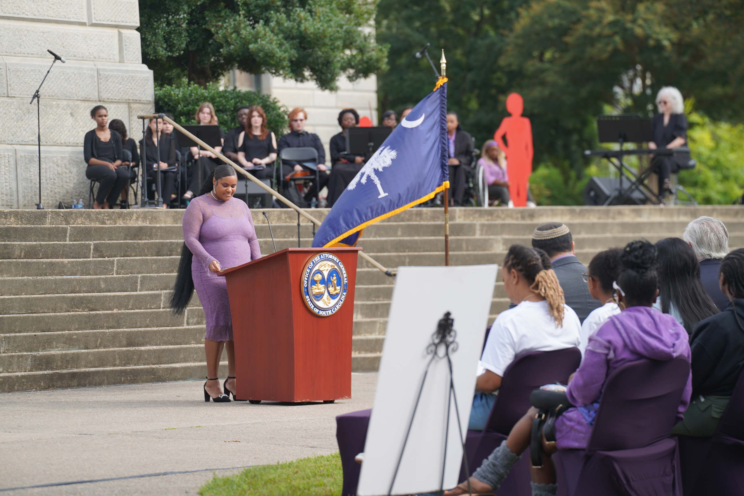 S.C. attorney general Alan Wilson led the ceremony, drawing families, survivors, and advocates from across the state. One by one, as the names of each of the thirty-five women and eleven men were called, relatives carried life-sized silhouettes forward as a bell tolled in remembrance of their lives.